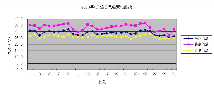 本月平均气温29.0℃,较常年偏高0.1℃。其中,上旬偏高0.8℃,中旬、下旬分别偏低0.1℃、0.3℃;极端最高气温36.5℃,出现在25日,极端最低气温24.3℃,出现在22日。