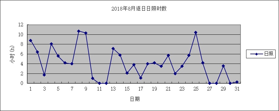月日照总时数为127.8小时,与累年值比偏少3成。其中,上旬日照时数与累年值基本持平,中旬、下旬与累年平均值比分别偏少4成多、近5成。